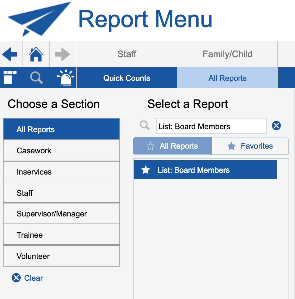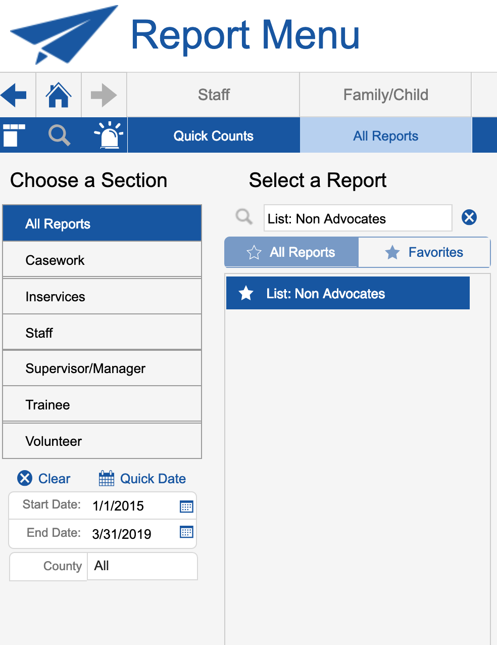 Report for this is: List: Non Advocates *(once you run the report, the field on the far right shows the type of NAV role for each vol; there could be more than one based on which boxes are checked on the volunteers’ records). Note that you must enter a date range.
