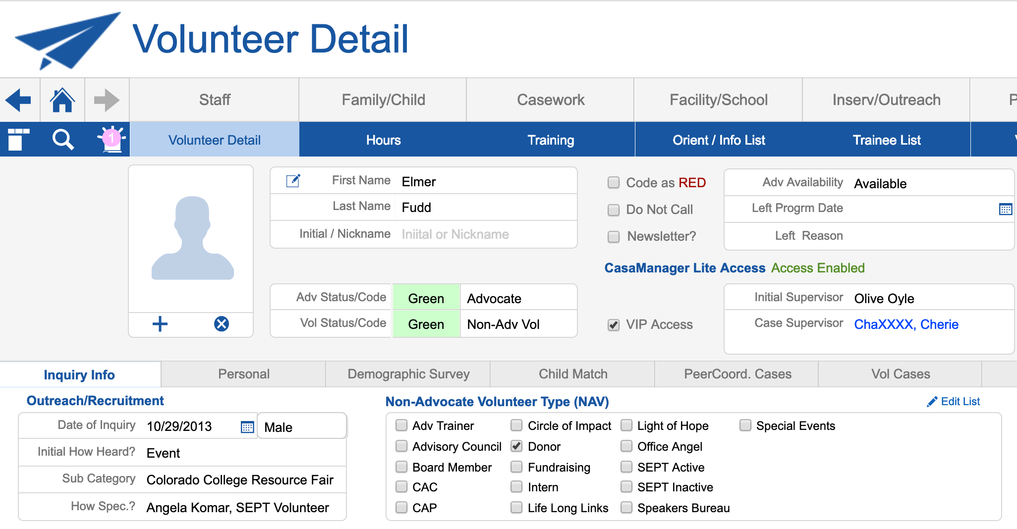 *Note the ‘Vol Status/Code’ (not ‘Adv Status/Code’): The status (green, yellow, red) is an indicator as to when the last Non-Case Hours were entered for anyone with a checkbox checked under the Non-Advocate Volunteer Type (NAV). Many agencies do add their non-case hours for their volunteers but just as many don’t. (I think we should if they are donating their time, and it gives you better reporting to see the impact of how much time community citizens are donating to your agency beyond casework).