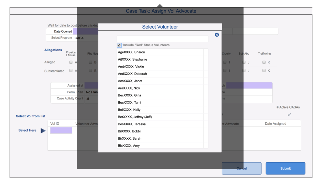 In Case Tasks, once you choose “Select Vol from List” then “Select Here”, your list of green and yellow status volunteers shows up. On that screen, there is a checkbox labeled “Include Red Status Volunteers”. Simply check that box for your Red status volunteers to appear in the list and you can then select any Red status volunteer to assign to the case.