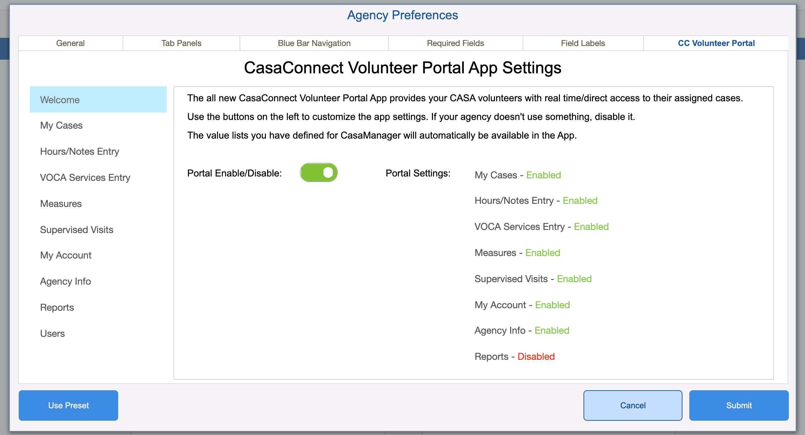 1. In your agency-level preferences, make sure that you enable the CC portal by sliding the button on (green).